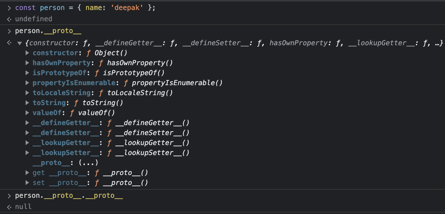 person.name = 'Deepak';The person object extends from the Object.prototype object.